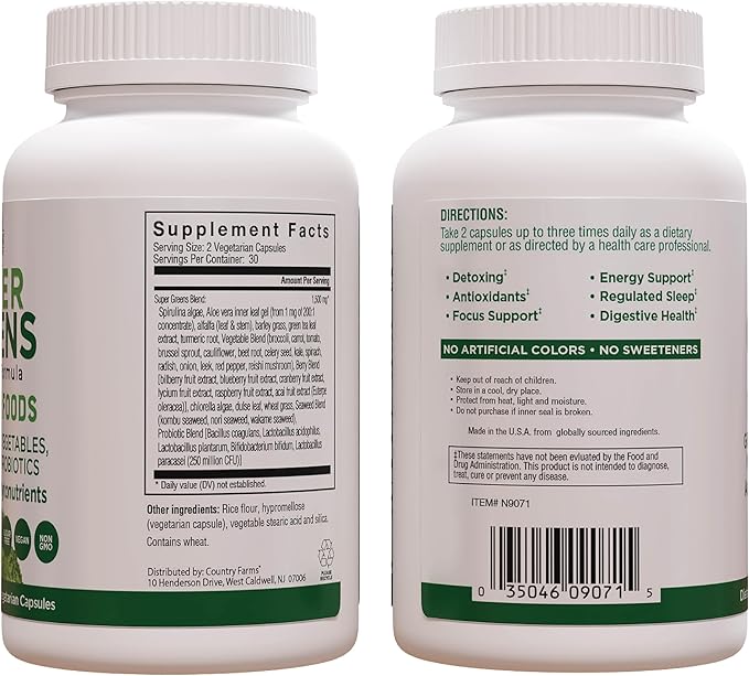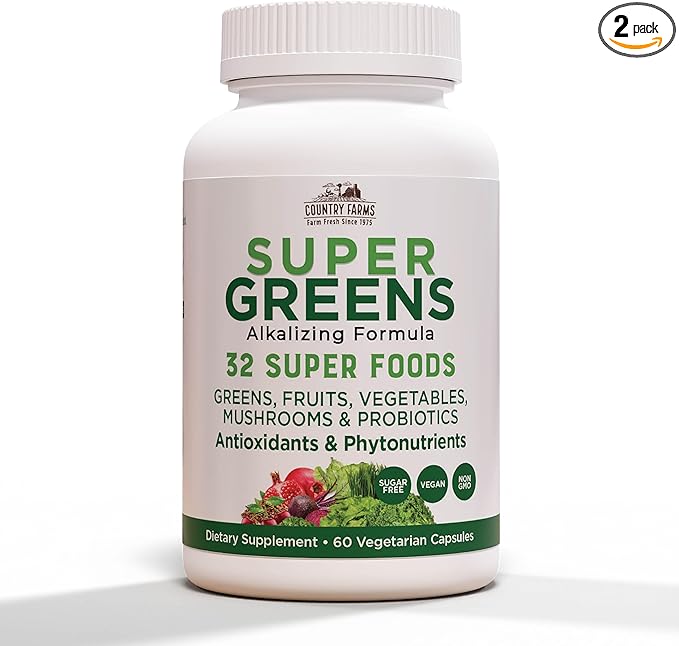 COUNTRY FARMS Super Greens Vegicaps, 32 Super Foods, Whole Food Supplement, Greens, Fruit, Vegetables, Mushrooms & Probiotics, Rich in Antioxidants & Phytonutrients, 120 Count, 60 Servings