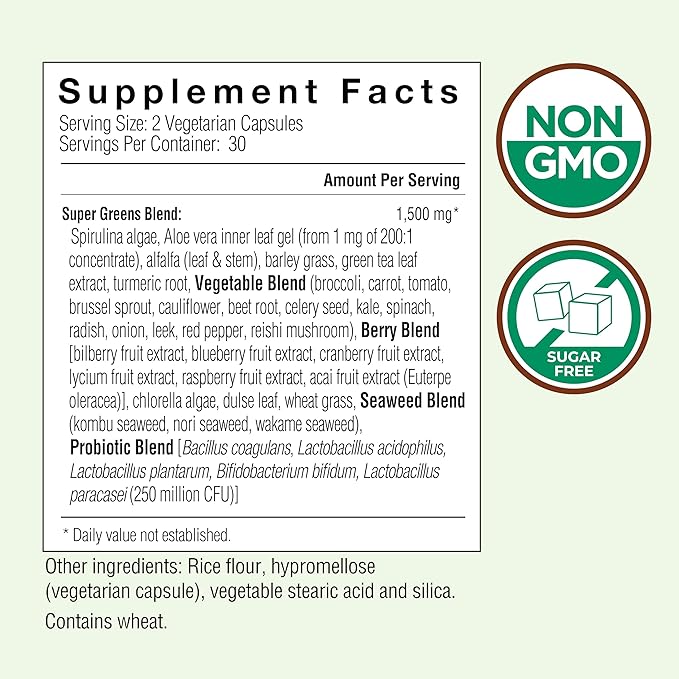 - PROBIOTIC BLEND TO ENHANCE ABSORPTION. The addition of a 5-strain probiotic blend, along with turmeric root and reishi mushroom, enables Super Greens VegiCapsules to help promote proper digestion. In addition, this blend enhances the absorption of the phytonutrients found naturally in the whole food ingredients.
