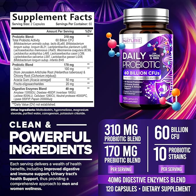 Built by Nature Probiotic for Women & Men – 60 Billion CFU, 10 Strains + Prebiotics & Digestive Enzymes – Supports Digestive, Immune, Reduce Gas & Bloating – Shelf Stable, Non-GMO - 120 Capsules