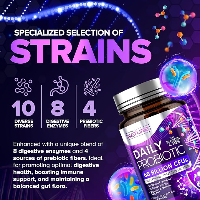 - 60 Billion CFU & 10 Strains – High-potency formula for comprehensive gut support
