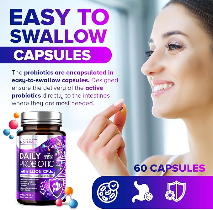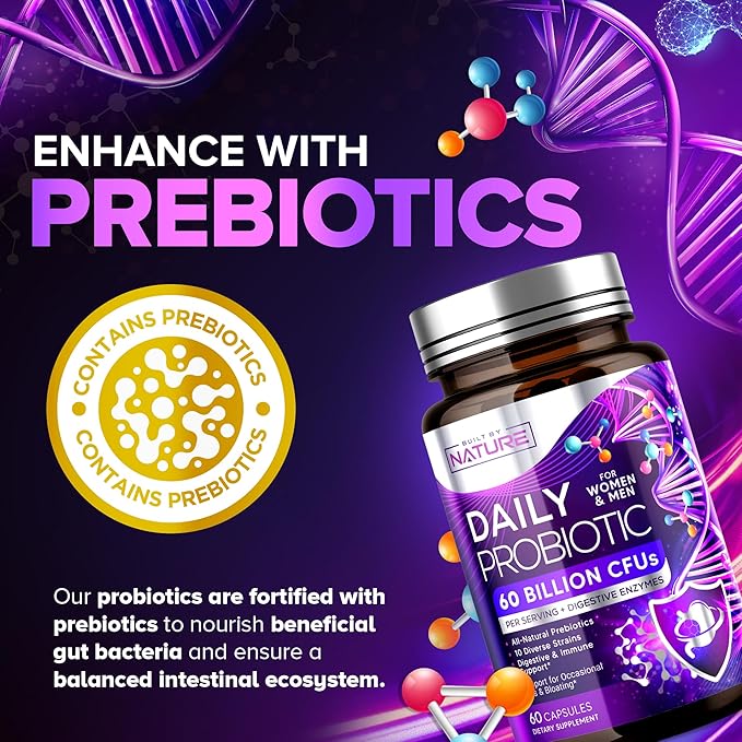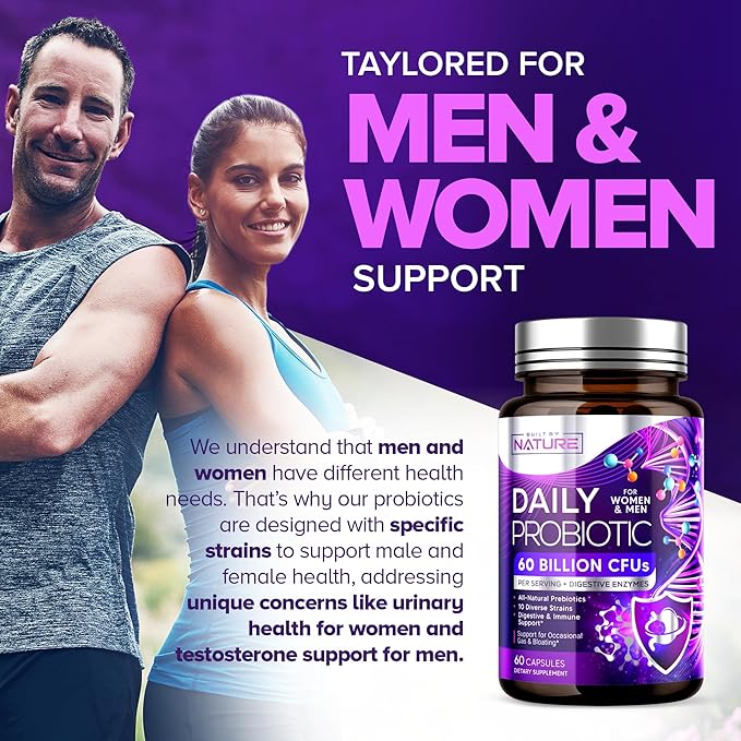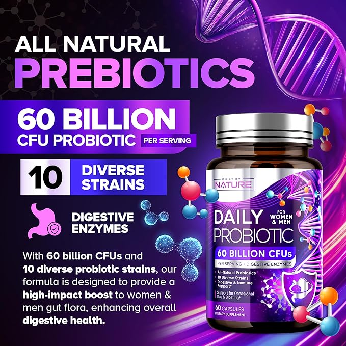 Built by Nature Probiotic for Women & Men – 60 Billion CFU, 10 Strains + Prebiotics & Digestive Enzymes – Supports Digestive, Immune, Reduce Gas & Bloating – Shelf Stable, Non-GMO - 60 Capsules