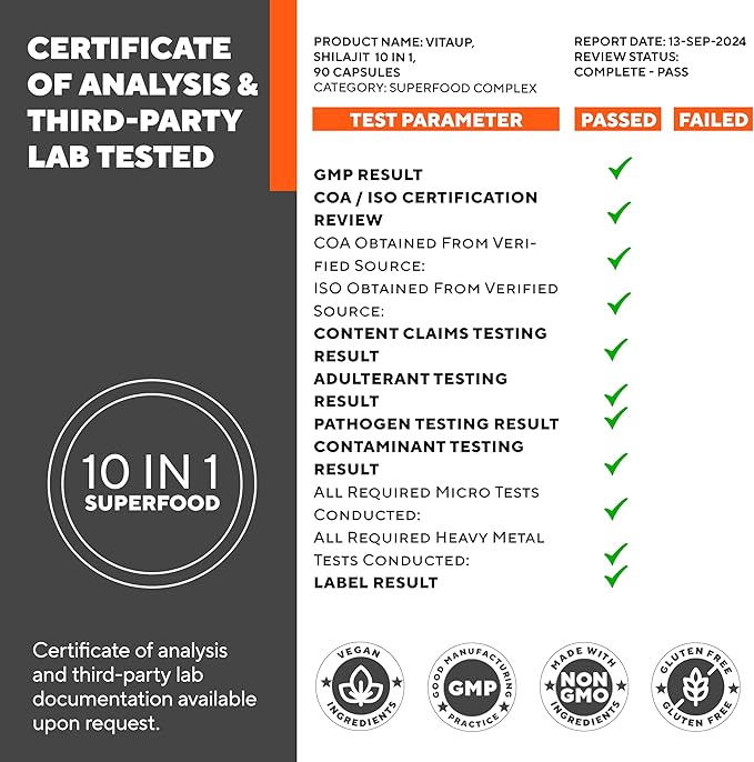 - GMP CERTIFIED: Manufactured in an FDA-registered facility, VitaUp Himalayan shilajit capsules for men meet all required GMP standards. Each batch of our shilajit pills includes kava kava root powder and undergoes third-party lab testing to ensure purity and potency. We do not use any GMOs, gluten, or preservatives.*