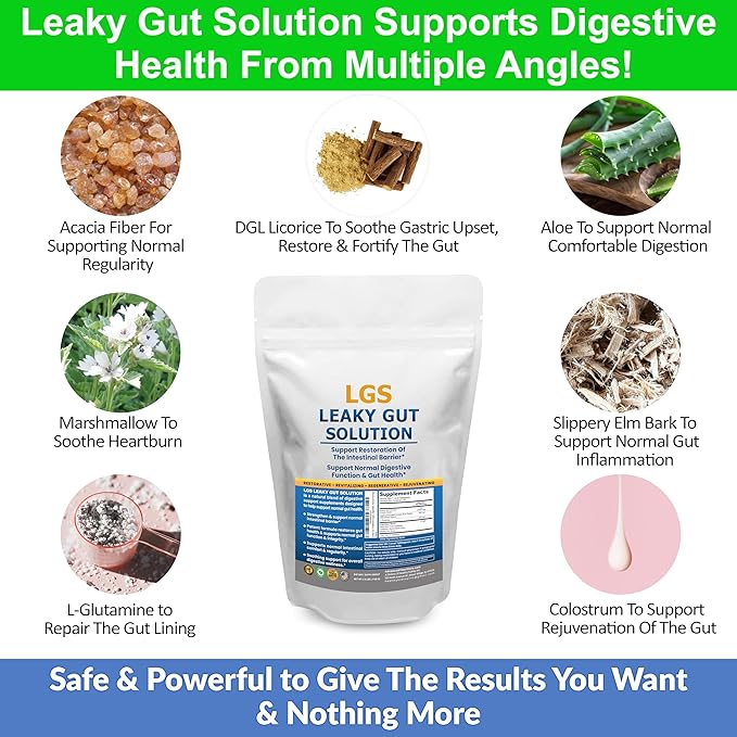 - Be Done with Leaky Gut. Digestive issues make life hard to live! Leaky gut solution turns all that around. A complete gut repair powder with a whopping 6 grams of prebiotic soluble fiber per serving, colostrum, l-glutamine & more plus the Leaky Gut Solution user guide for best use and email support from digestive health coaches to answer any questions & provide clarity. Restore, rejuvenate, and support your gut health with nature's natural digestive and leaky gut repair supplement.