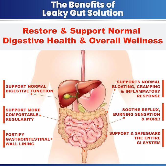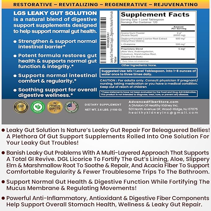 - This leaky gut repair supplement supports normal bloating & regularity, thanks to its soluble fiber prebiotic gut repair action. Mega dose licorice coats mucous membranes in the stomach and entire digestive system to support normal inflammation, providing a GI revive effect while facilitating smooth elimination. Acacia Fiber helps support normal regularity and gut restoration along with L-Glutamine & Colostrum. Stop digestive distress, discomfort and indigestion, while you restore your gut.