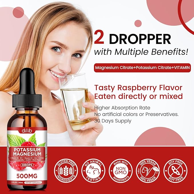 - ADVANCED FORMULA: Our liquid potassium magnesium drops Contain Potassium Citrate 99 mg, Magnesium Citrate 500 mg, Ashwagandha, Calcium, Zinc, Vitamin D3, B6, B12, Coenzyme Q10, Black Pepper. potassium magnesium citrate drops are an excellent alternative to pills, capsules, or tablets, with high bioavailability and good absorption