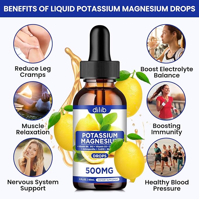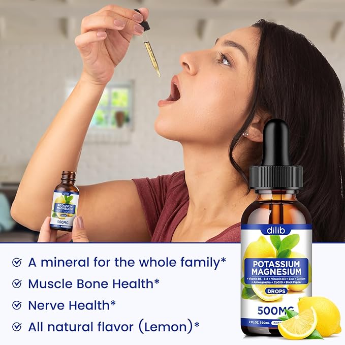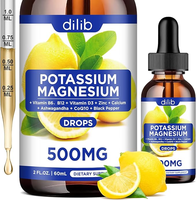 - ADVANCED FORMULA: Our liquid potassium magnesium drops Contain Potassium Citrate 99 mg, Magnesium Citrate 500 mg, Ashwagandha, Calcium, Zinc, Vitamin D3, B6, B12, Coenzyme Q10, Black Pepper. potassium magnesium citrate drops are an excellent alternative to pills, capsules, or tablets, with high bioavailability and good absorption