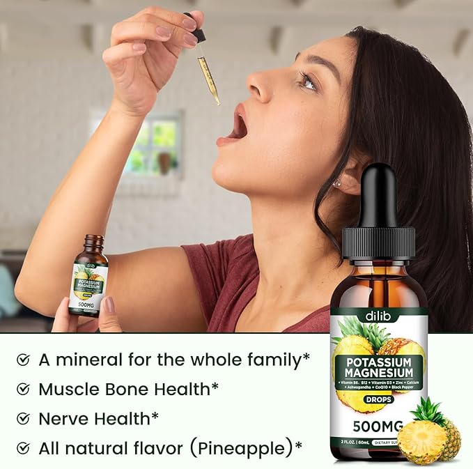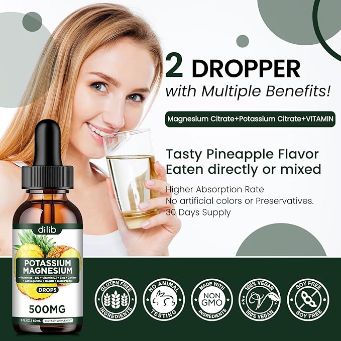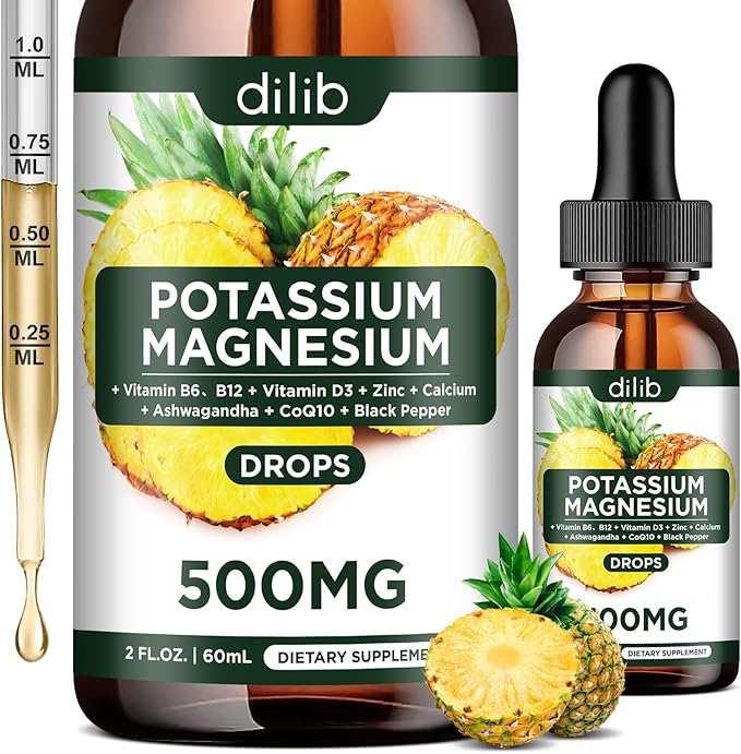 - ADVANCED FORMULA: Our liquid potassium magnesium drops Contain Potassium Citrate 99 mg, Magnesium Citrate 500 mg, Ashwagandha, Calcium, Zinc, Vitamin D3, B6, B12, Coenzyme Q10, Black Pepper. potassium magnesium citrate drops are an excellent alternative to pills, capsules, or tablets, with high bioavailability and good absorption