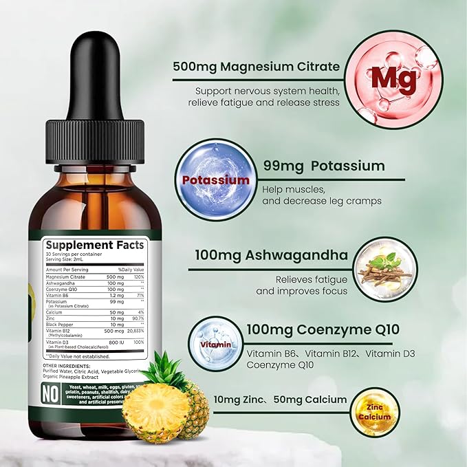 Potassium Magnesium Citrate Supplement, Liquid Magnesium Citrate Drops 500mg with Ashwagandha, Calcium, Zinc, Vitamin D3, B6, B12, CoQ10 - Vegan 2 fl oz Pineapple Flavor