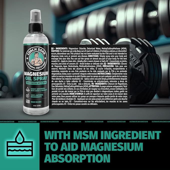 Coach Soak Magnesium Body Spray with MSM, Unscented, Extra Strength Magnesium Chloride, Pure Topical Magnesium Oil Spray for Feet & Body, Made in USA (2-Pack, 16 Fl Oz Total)