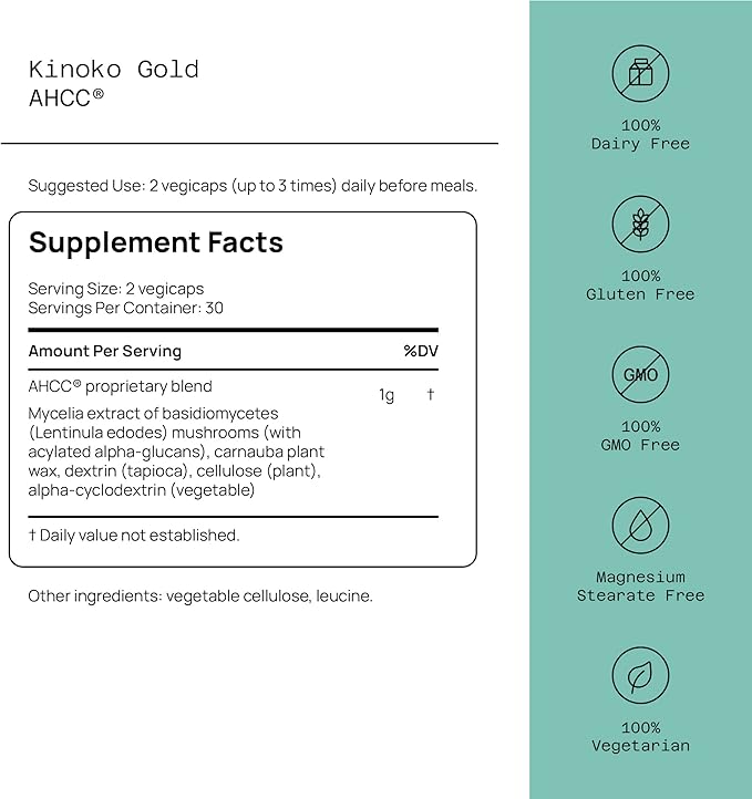 - SUPPORTS IMMUNE HEALTH, & LONGEVITYY: Kinoko Gold AHCC capsules have shown to support immune health, enhance cytokine production, promote macrophage activity, T-cell and NK cell activity and longevity. Our Kinoko AHCC capsules are easy to swallow, convenient and tasteless. Each AHCC 500mg capsules gives you powerful long lasting immune support.