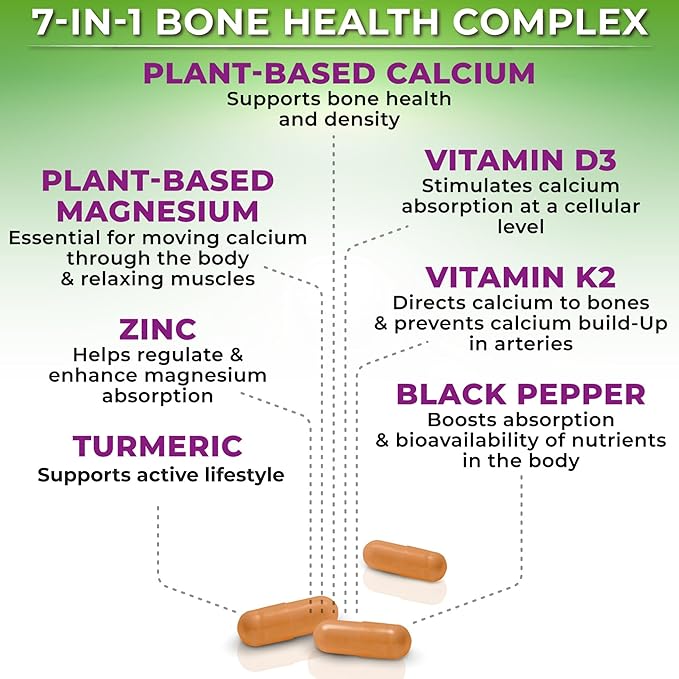 - 7-in-1 Bone Health Complex: Magnesium and vitamin D3 are essential for calcium bioavailability. Zinc enhances magnesium absorption, while vitamin K2 directs calcium to the bones. Turmeric supports active lifestyle and overall wellness, and black pepper improves nutrient bioavailability.