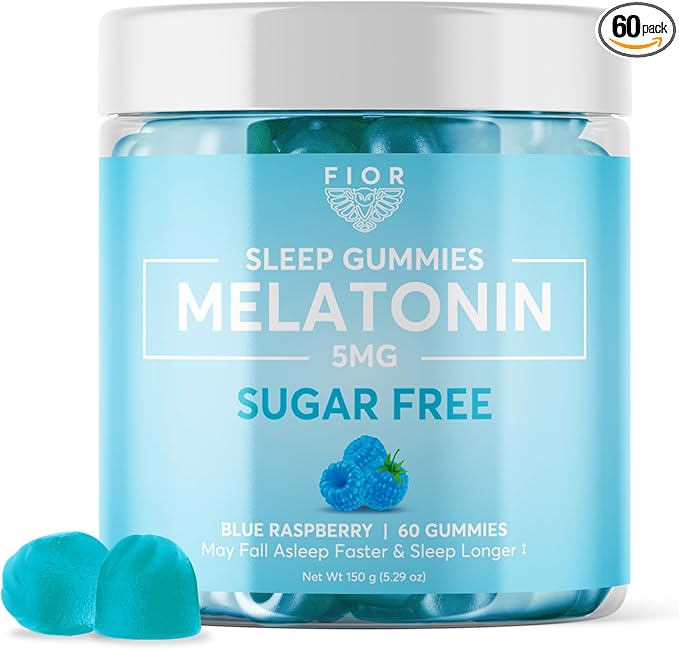 FIOR Sugar Free Blue Raspberry 60-Count Melatonin Gummies 5mg Sleep Aids for Adults & Kids. Gummy Vitamins for Sleep. Adults & Kids Melatonin & L-Theanine Gummies Natural Herbal Sleep Aid.