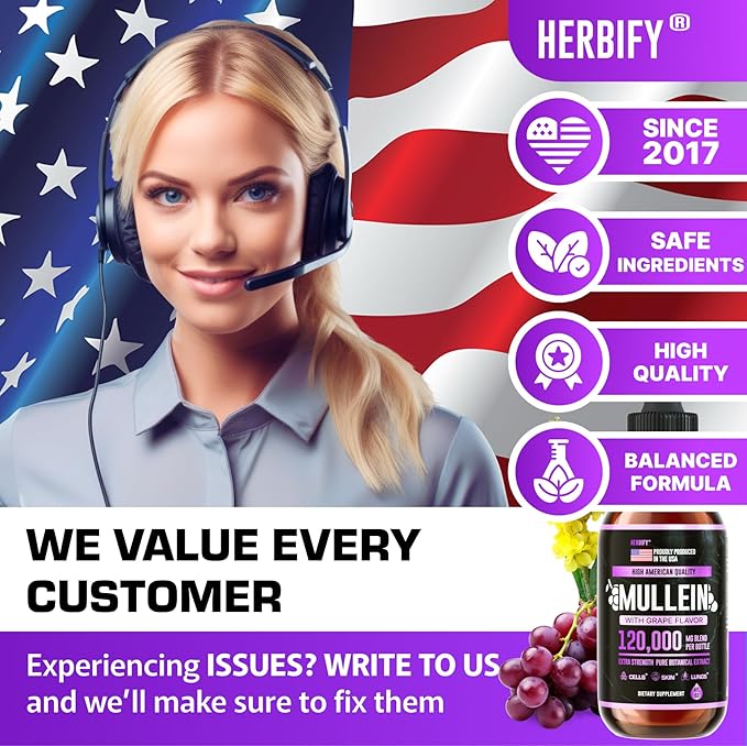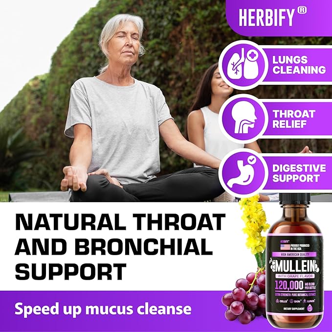 HERBIFY Mullein Drops - Lung Cleanse - Leaf Extract - Powerful Mullein for Immune Support, Detox & Respiratory Support - Made in USA - Herbal Supplements - 4 Oz Grape Flavor