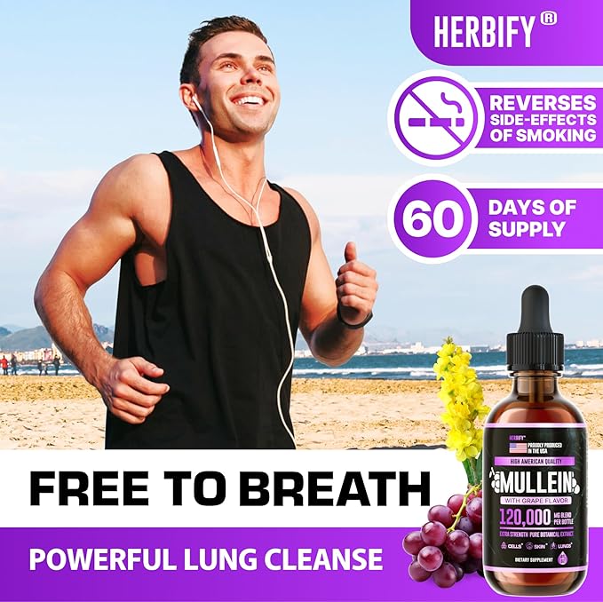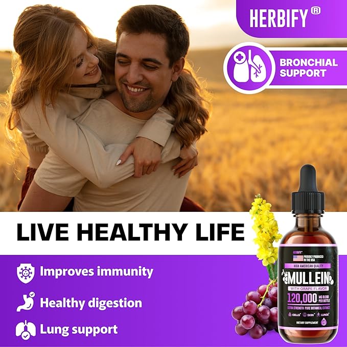 HERBIFY Mullein Drops - Lung Cleanse - Leaf Extract - Powerful Mullein for Immune Support, Detox & Respiratory Support - Made in USA - Herbal Supplements - 4 Oz Grape Flavor