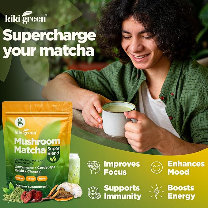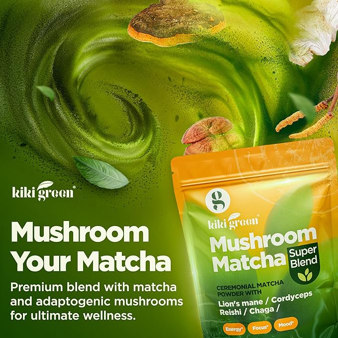KIKI Green Mushroom Matcha Super Blend - Matcha Powder with Lion's Mane, Chaga, Reishi, Cordyceps - Mushroom Coffee Alternative for Energy, Focus, Immunity - 8 oz, 40 Servings