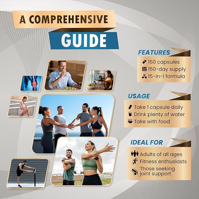 Glucosamine Supplement- 15-in-1 Natural Blend with Chondroitin sulfate Hyaluronic Acid Methylsulfonylmethane Turmeric Ginger Vitamin C, D3-150 Count - Made & Tested in The USA