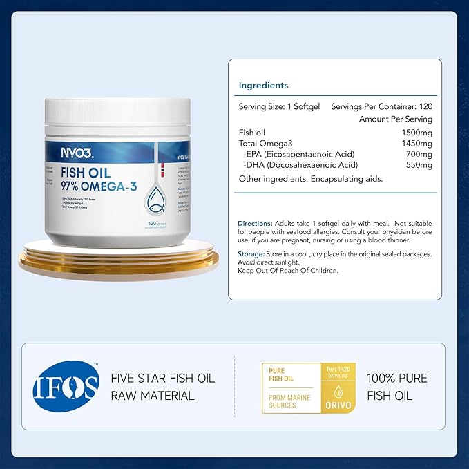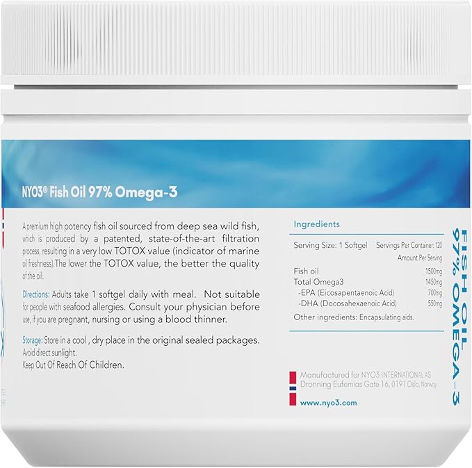 - rTG Omega-3 Formula: 5X high absorption than EE formula fish oil. With 1500mg of fish oil per serving, NYO3 omega 3 supplement provides the recommended daily amount of EPA & DHA to help lower triglyceride levels and promote overall wellness.