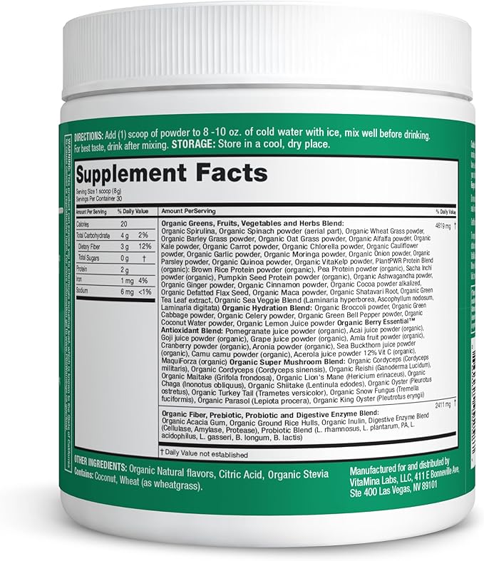 - Organic Supergreens Powder: Each serving has 7g and 70+ types of superfoods and 3g of fiber to support overall wellness. Our blend also has organic greens, fruits, vegetables, herbs, super mushrooms, and prebiotics/probiotics with digestive enzymes