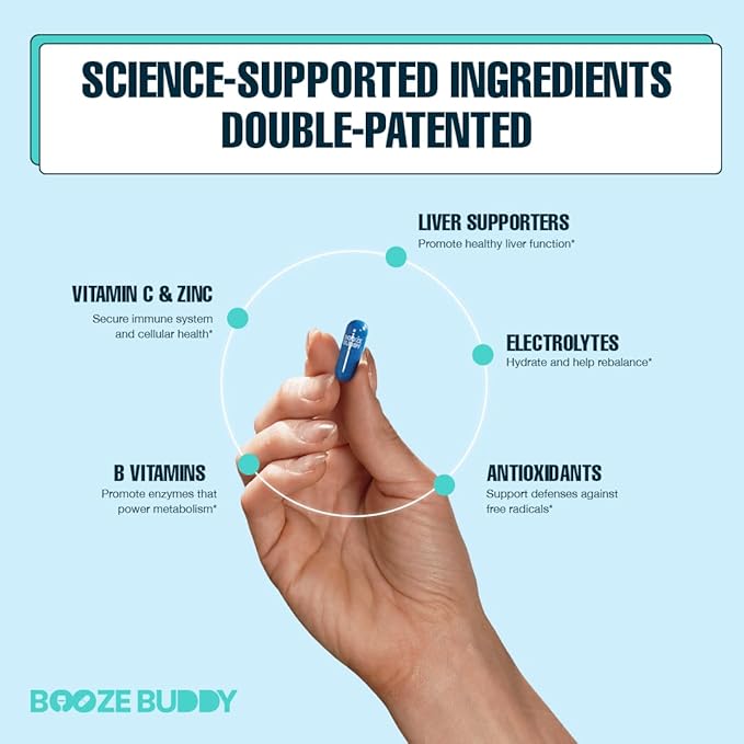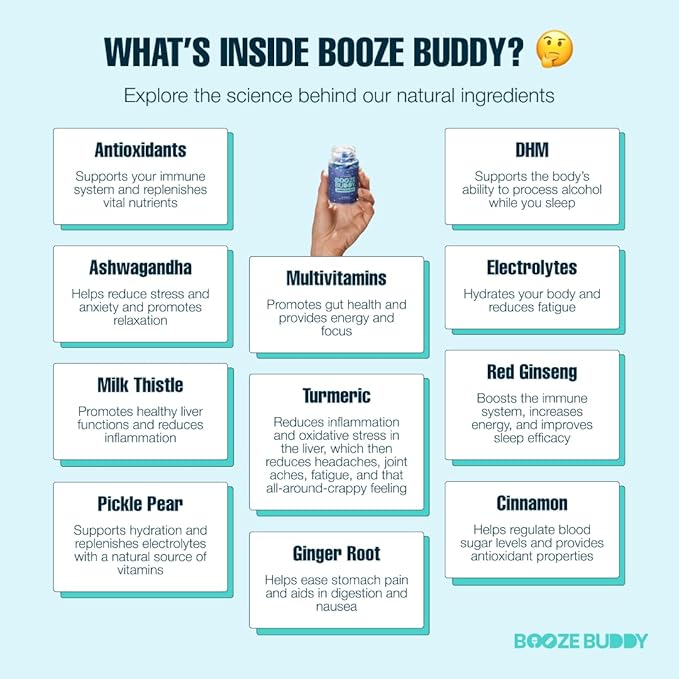 - Celebrate Without Worry: Don’t hesitate to seize the moment and celebrate until dawn from fear of having a bad day because Booze Buddy has got you covered! Our liver support supplement contains many nutrients that help you wake up refreshed and happy after a fun night!