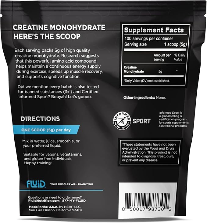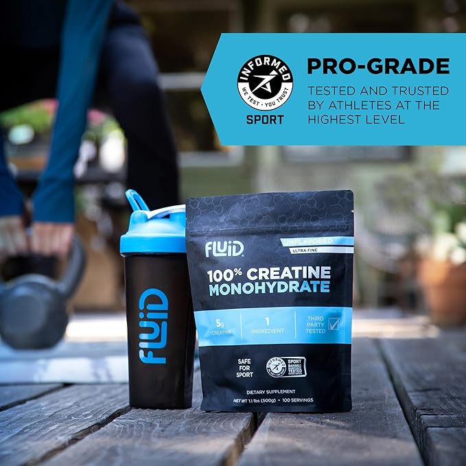 Fluid Creatine - 100% Creatine Monohydrate Powder, Unflavored, Informed Sport Certified, 5g per Serving (100 Servings)