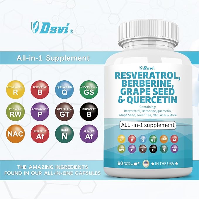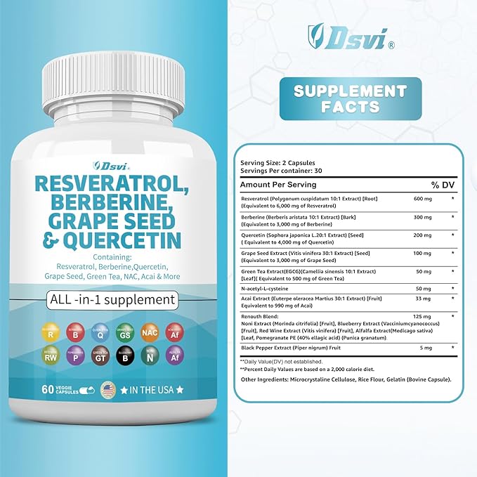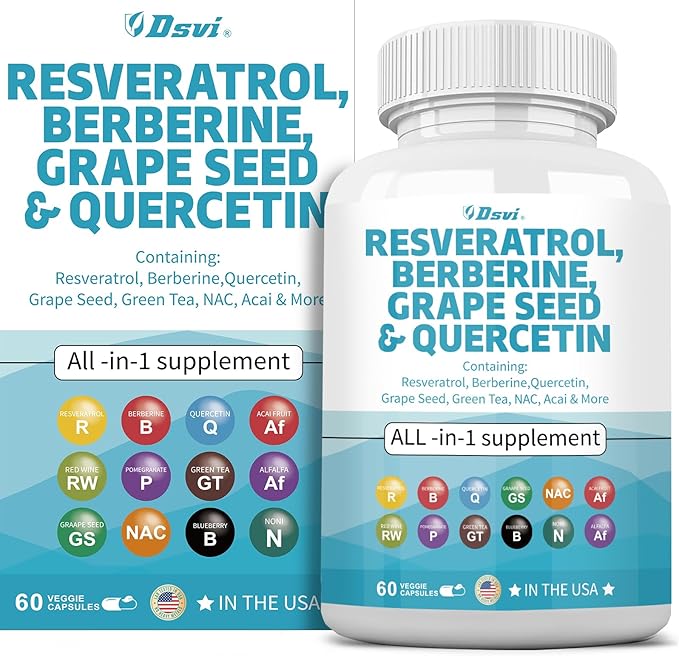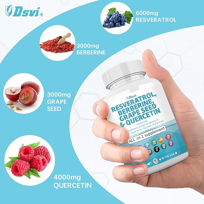 - Premium Material Formulas:Ideal All In One Grape Seed Extract Capsules & Berberine Supplements - Provides various full-dose products in one complex containing a full Resveratrol Berberine, Quercetin Supplements, Grapeseed Extract Capsules, Acai Extract, Noni Extract, Blueberry Extract, Alfalfa Extract, and Pomegranate in a convenient 2 capsule dosage. Finally, a stronger supplement than berberine 500mg, quercetin 500mg, or berberine 1000mg have been packed into one solution.
