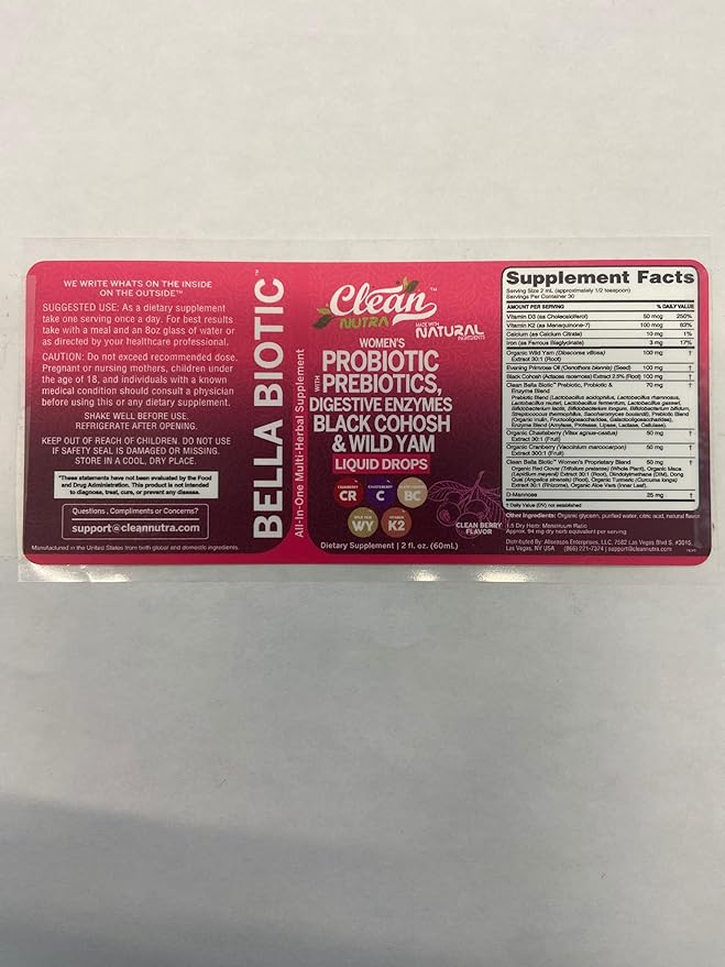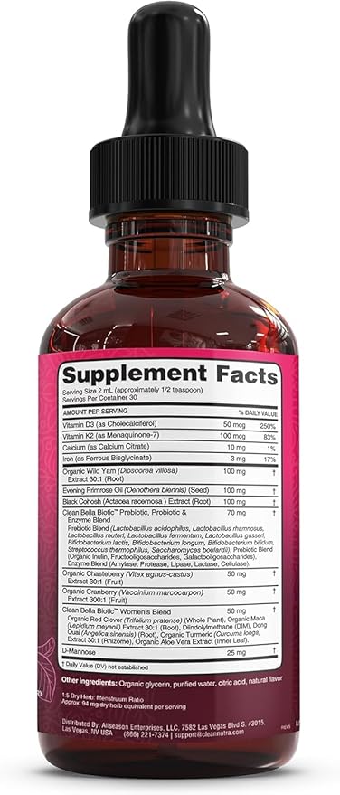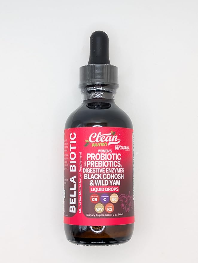 Liquid Probiotics for Women Drops with Chasteberry, Black Cohosh, Prebiotics, Digestive Enzymes, Evening Primrose Oil, Wild Yam, Cranberry Dmannose and Iron Vitamin D3 K2 Clean Nutra Bella Biotics (3)