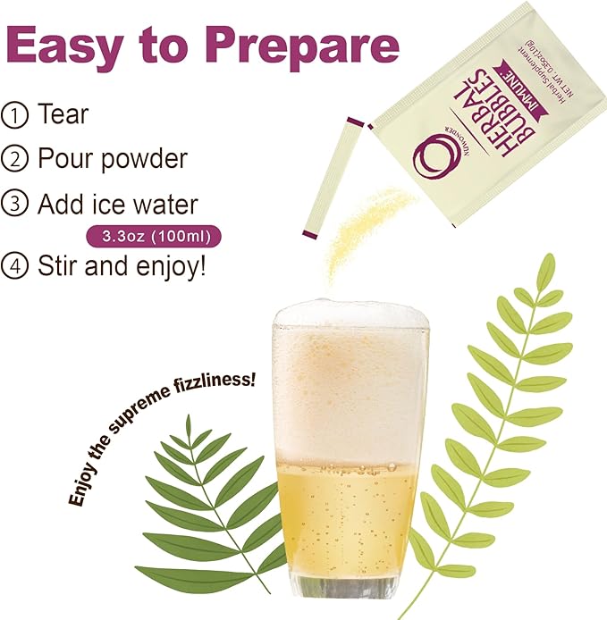 - ❰Delicious & Refreshing Drink in a Minute❱ Delightful Fizziness - Add 3.3oz icy water and pour powder, swirl, and watch as all-herbal bubbles rise to the top! A mini-party in under a minute. A mini-party in under a minute. It’s that easy to sprinkle in tropical, delicious, and refreshing flavors that are not artificially sweetened, yet will satisfy your taste buds.