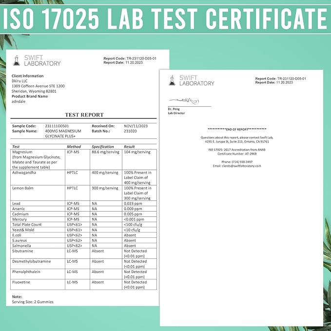 - GMP and ISO 17025: Adndale Magnesium Glycinate Plus+ gummies undergo production in a GMP certified facility and are third-party tested by an ISO 17025 certified lab. Lab testing of each batch ensures reliability and effectiveness as a resting support solution, with the test certificate included in the product listing.