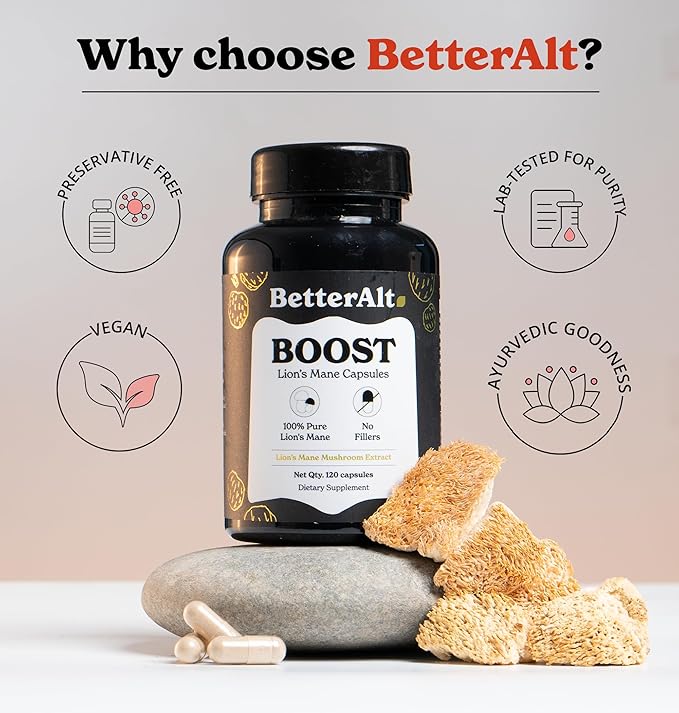 - 100% Vegan, Gluten-Free & Non-GMO Formula: Made with plant-based capsules and no animal-derived ingredients, BetterAlt Lion’s Mane is perfect for vegan and gluten-free lifestyles. Free from GMOs, fillers, and artificial additives.