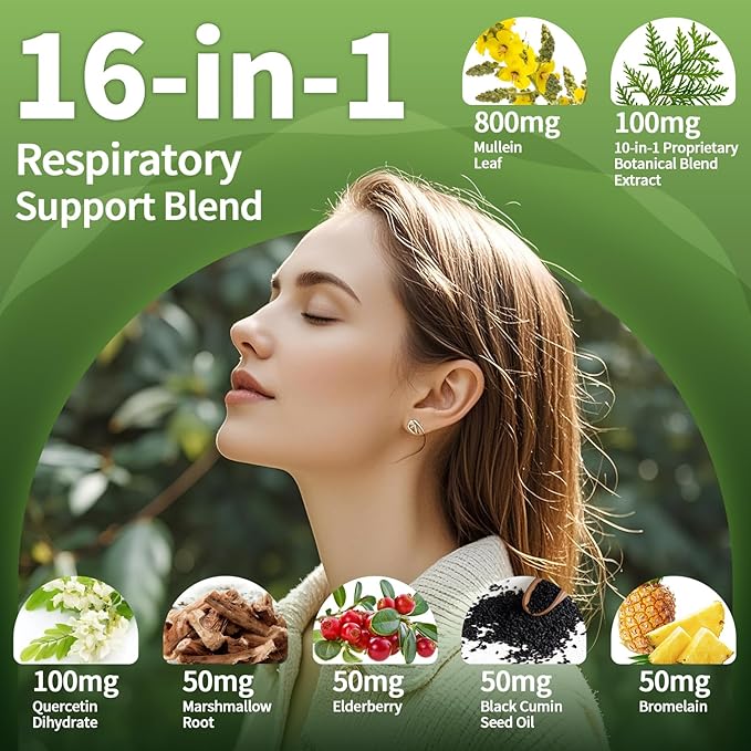 - Mullein Leaf Extract & More Beneficial Ingredients - Includes 800mg Mullein Leaf extract, 100mg quercetin cihydrate, 50mg marshmallow root, 50mg elderberry, 50mg black cumin seed oil, 50mg bromelain & 100mg 10-in-1 proprietary botanical blend extract. Jointly helps respiratory health, lung cleanse, immune system, digestive function, energy & vitality.