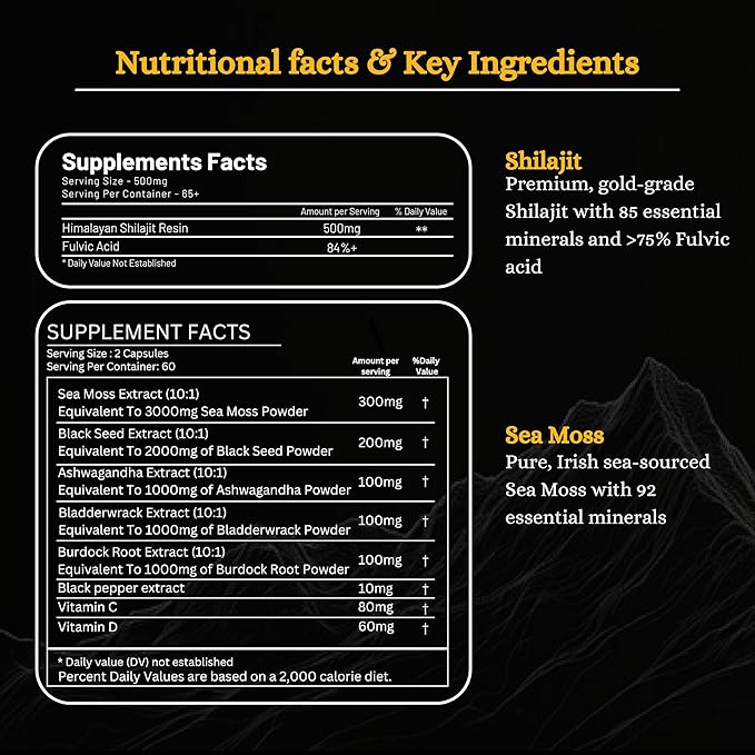 - All-In-One Supplement: Packed with Shilajit Resin, Sea Moss Supplement, Black Seed Oil capsules, Ashwagandha capsules, Burdock Root, and Bladderwrack, this powerhouse blend replaces countless supplements in your supplement cabinet. Includes Seamoss Powder, Black Seeds Oil, and Irish Seamoss Bladderwrack Burdock capsules for a complete health solution.
