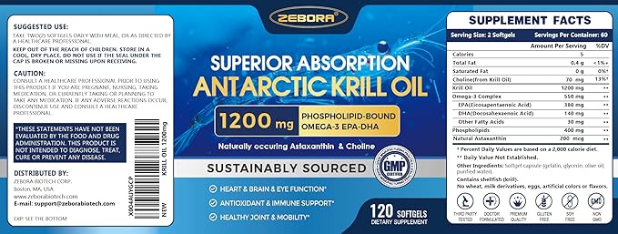 - Premium Antarctic Krill Oil: Our ZEBORA krill oil are the most sustainable omega and an excellent source of EPA and DHA, which offer you higher quality than omega-3 fish oil. It's benefit for your heart, brain, liver, joints, vision and skin health.