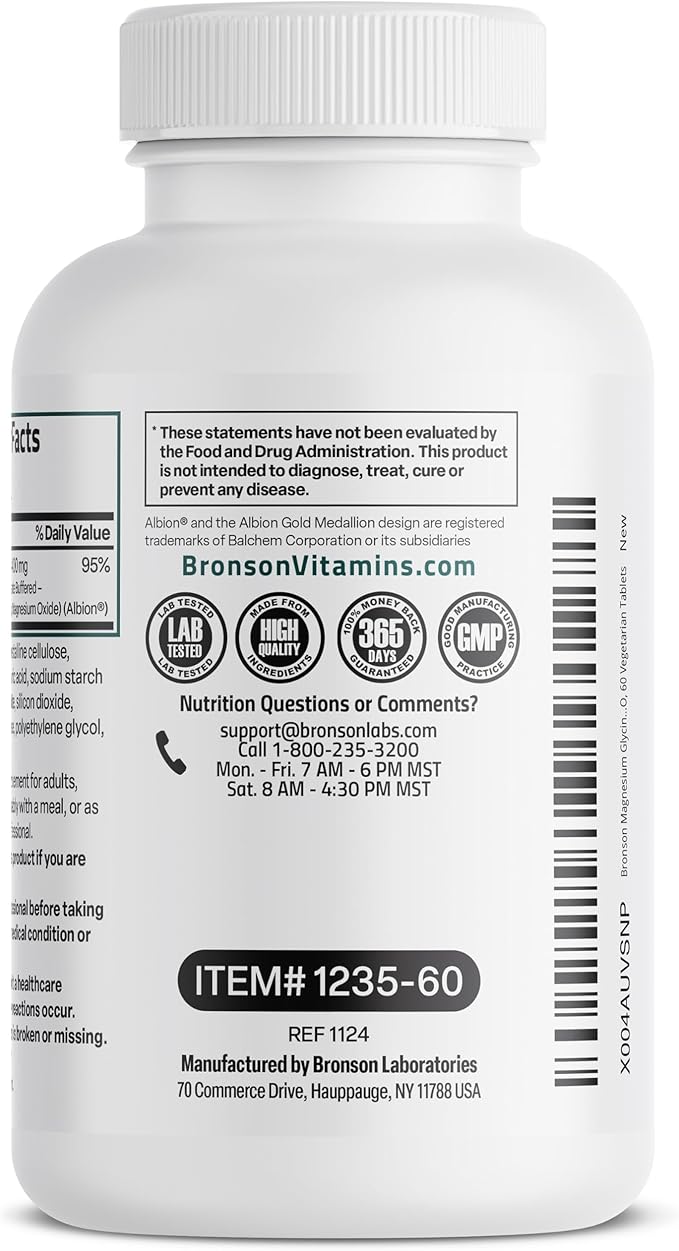 Bronson Magnesium Glycinate 400mg Extra Strength, Vegetarian, Chelated for Absorption Gentle on The Stomach, Non-GMO, 60 Tablets