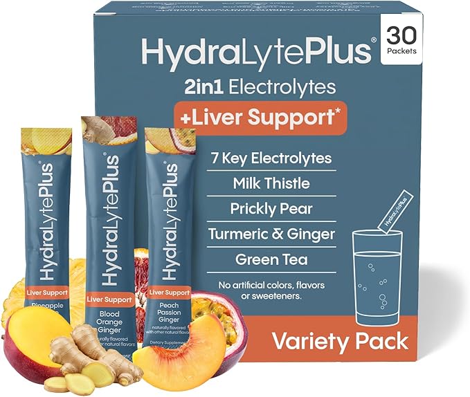 Hydralyte Liver Support + Electrolyte Mix with Milk Thistle, Turmeric, Ginger, Prickly Pear, Green Tea Extract Formulated for Rapid Rehydration (Variety Flavor, 30 Packets)