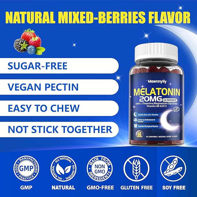 - HEALTHY INGREDIENTS & EXCEPTIONAL QUALITY: Our melatonin gummies 20mg are FREE FROM GMOs, gluten, gelatin, artificial colors, flavors, or preservatives. Certified by GMP and subjected to rigorous third-party testing, we ensure the accuracy of the purity and potency of each gummy. We are dedicated to offer best quality products for the best value, giving you complete confidence in the substances you ingest.If you have any concerns about the product received, reach out promptly for assistance.