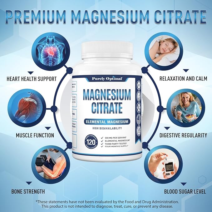 - Heart Health & Circulation: Magnesium is essential for cardiovascular wellness. Purely Optimal’s 500mg Magnesium Citrate supports heart health and optimal blood flow, promoting a balanced lifestyle with each daily dose. Your heart deserves the best care with this trusted formula