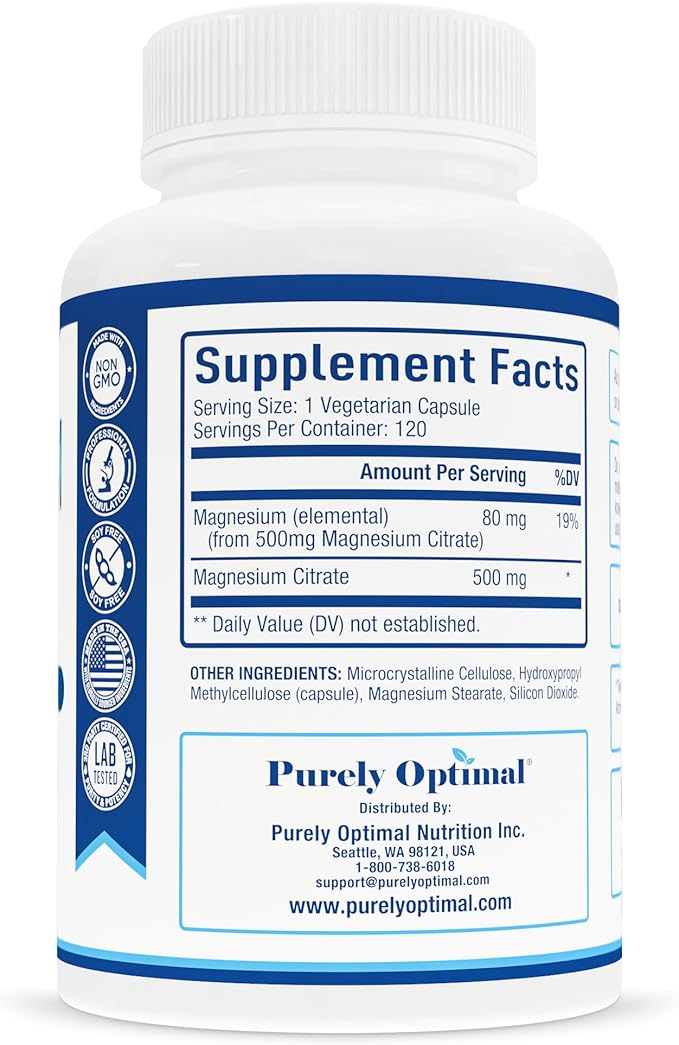 Purely Optimal Magnesium Citrate 500mg - Citrato de Magnesio, Supplement for Sleep, Heart, Nerves, Muscles - Gluten-Free, Non-GMO, 120 Capsules