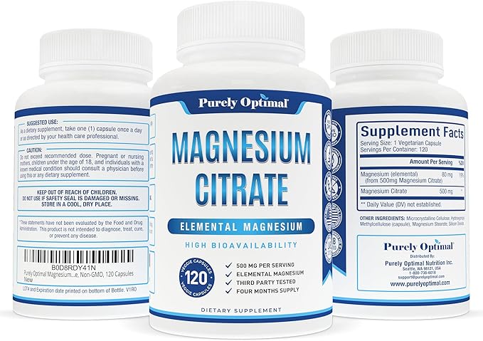 - Ultimate Muscle & Nerve Support: Purely Optimal Magnesium Citrate 500mg helps relax tense muscles and supports nerve function, making it ideal for those seeking relief from occasional discomfort and tension. Enjoy everyday comfort with just one capsule and a 4 months supply