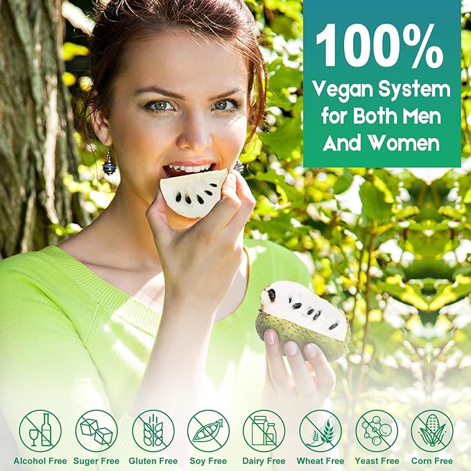 - 100% VEGAN SYSTEM: The soursop liquid drops formula is meticulously crafted, free from artificial colors and unnecessary additives. Soursop drops offer a comprehensive range of benefits, including being Alcohol-Free, Sugar-Free, Gluten-Free, Soy-Free, Dairy-Free, Wheat-Free, Yeast-Free, and Corn-Free. Embracing a green, vegan lifestyle has become the new standard for a healthier, more sustainable living. Start your day with the refreshing goodness of soursop drops, a delightful way to nourish your body and mind.