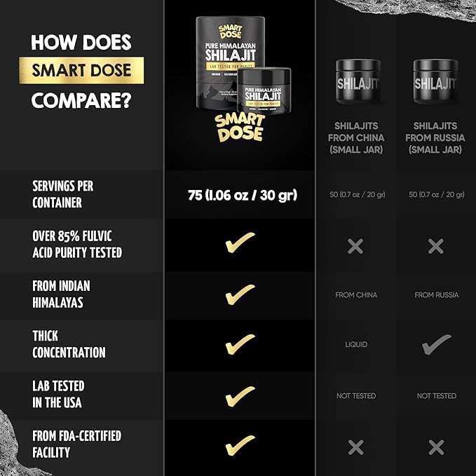 - PROBABLY THE PUREST SHILAJIT AVAILABLE: Smart Dose Pure Himalayan Shilajit is among the purest on the market, verified by a third-party lab in the USA to contain over 85% fulvic acid. Every batch undergoes rigorous testing for purity, toxins, and heavy metals, delivering an unmatched and authentic Shilajit experience.