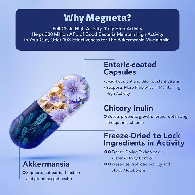 - Akkermansia Gut Health - Megneta Akkermansia probiotic Capsules with 300 Million AFU of patented strain Akkermansia muciniphila. It thrives on the gastrointestinal mucosa. In healthy intestines, Akkermansia strains constitute approximately 4% of the gut bacteria, crucial for maintaining a healthy gut microbiome.
