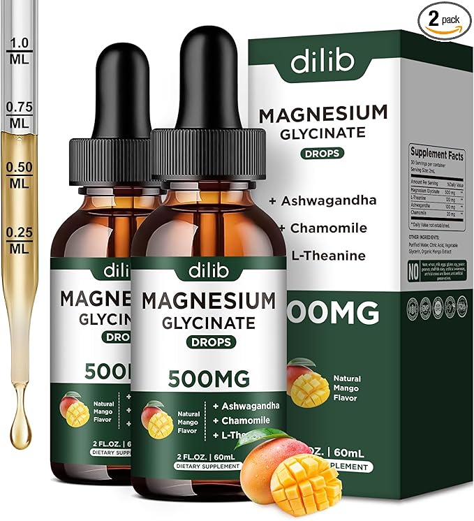 Magnesium Glycinate Supplement, Magnesium Liquid Drops with Magnesium Glycinate 500mg Ashwagandha, L - Theanine, Chamomile -Support Stress Relief, Bone, Muscle, Mood Vegan Natural Mango Flavor 2 Pack