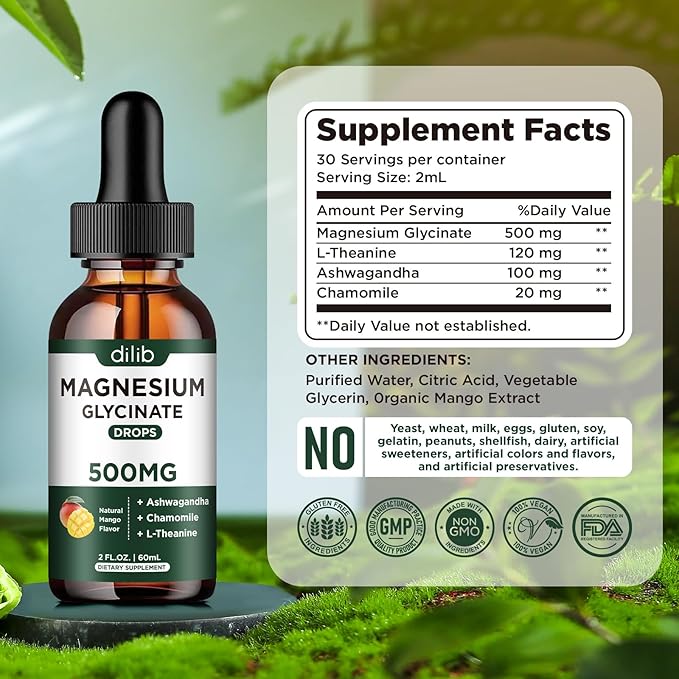 - NATURAL MANGO FLAVOR AND VEGETARIAN: The great tasting magnesium glycinate drops have a yummy mango flavor that everyone loves. And easier to take: directly into the mouth or placed under the tongue which may have a faster and higher absorption rate compared to capsules, pills, or gummies. It is soy free, non-GMO, gluten-free, dairy-free, and vegan-friendly which is more suitable for all men's and women's dietary needs