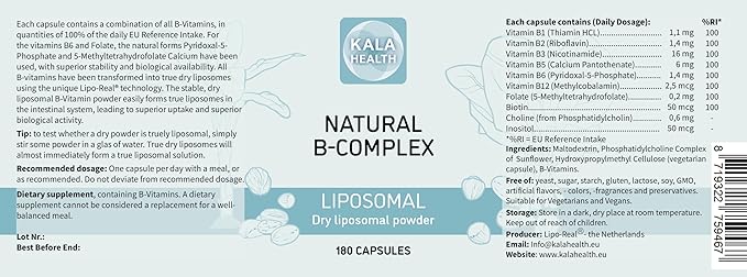 Kala Natural Liposomal B Complex Capsules with All 6 Important B Vitamins (180)