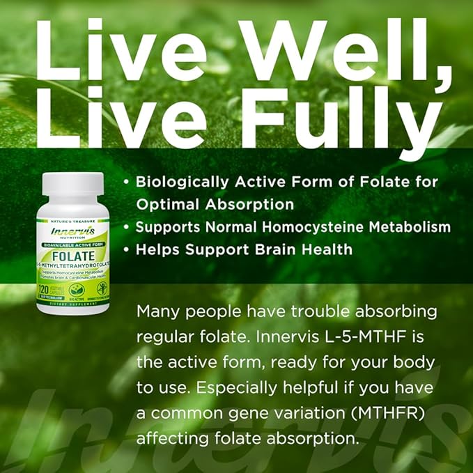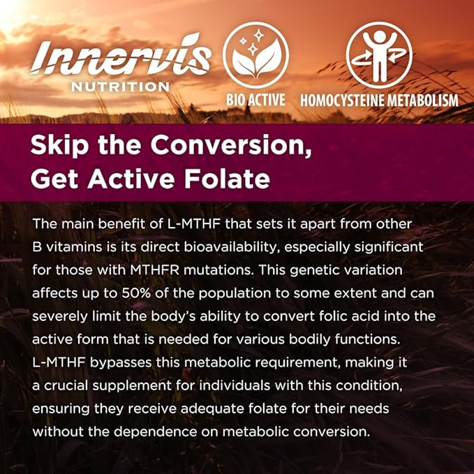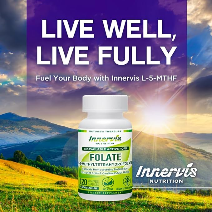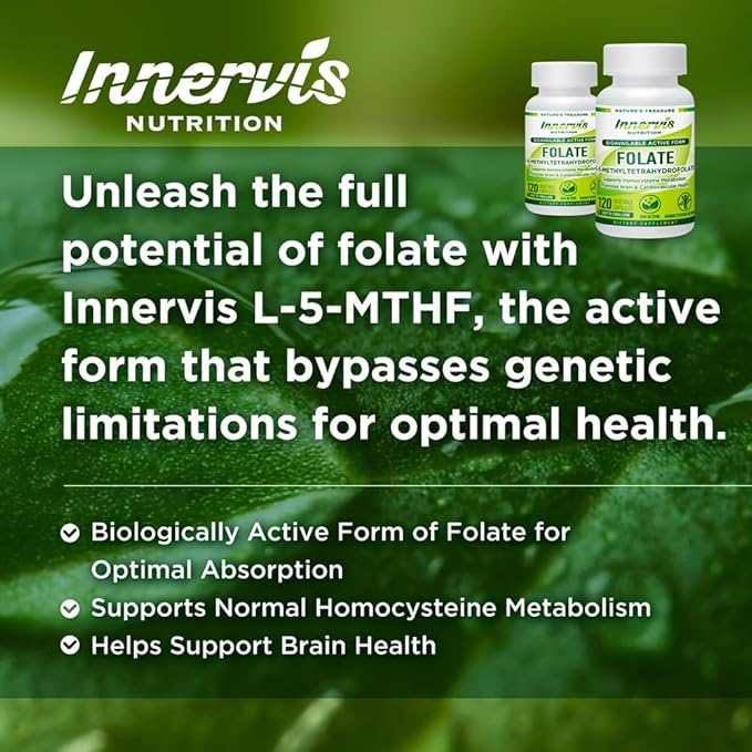 - BIO ACTIVE FOLATE – Discover Innervis Nutrition Bioavailable Active Folate L-5-MTHF, expertly formulated using the biologically active form of folate for optimal absorption. It supports normal homocysteine metabolism, and supports brain health. This comes with a 4-month supply of capsules, using only top quality ingredients and contains NO fillers, GMO, excipients, binders, additives or artificial ingredients.