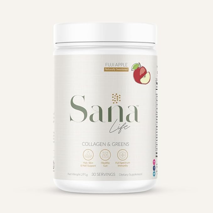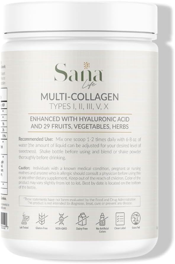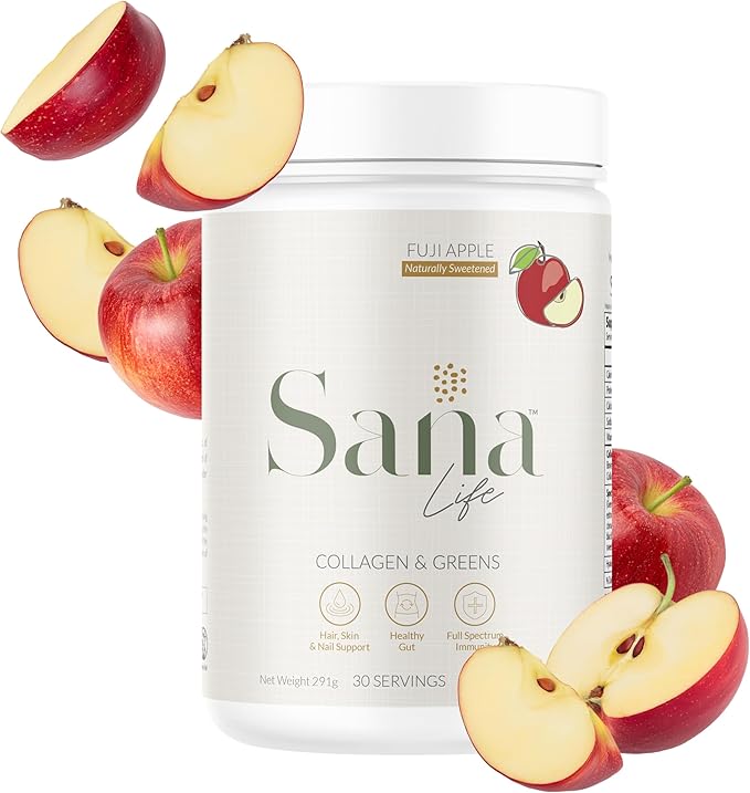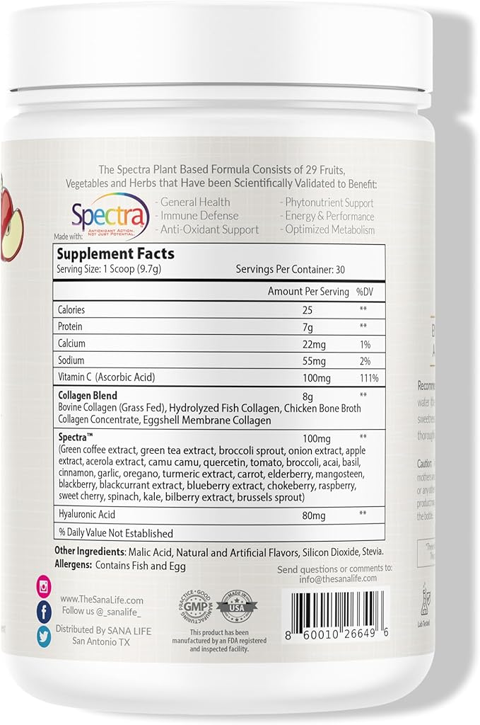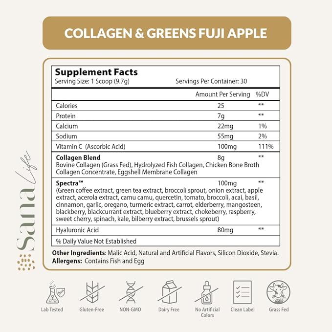 Collagen & Greens Powder, Multi-Collagen Supplement with Hyaluronic Acid for Skin, Hair, Nail & Gut Health - 30 Servings (Apple)