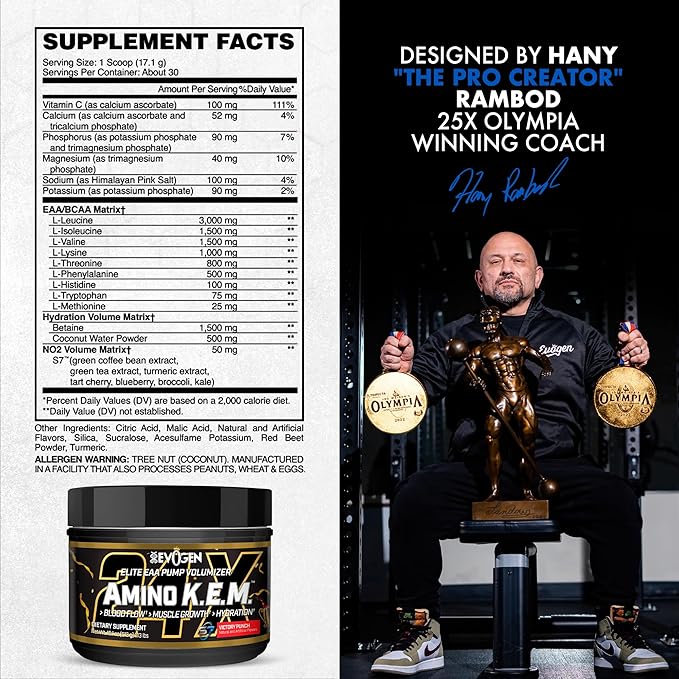 - DESIGNED BY THE PRO CREATOR – Developed by Hany Rambod, 25X Olympia-winning coach, Evogen Amino K.E.M. is a science-backed amino acid powder built to maximize hydration, muscle growth, and blood flow so you can train like a champion. Pair with Evogen pre workout supplements for even better results.