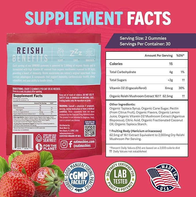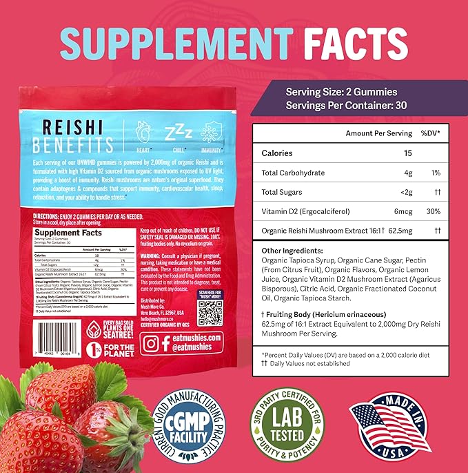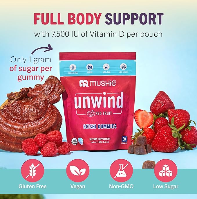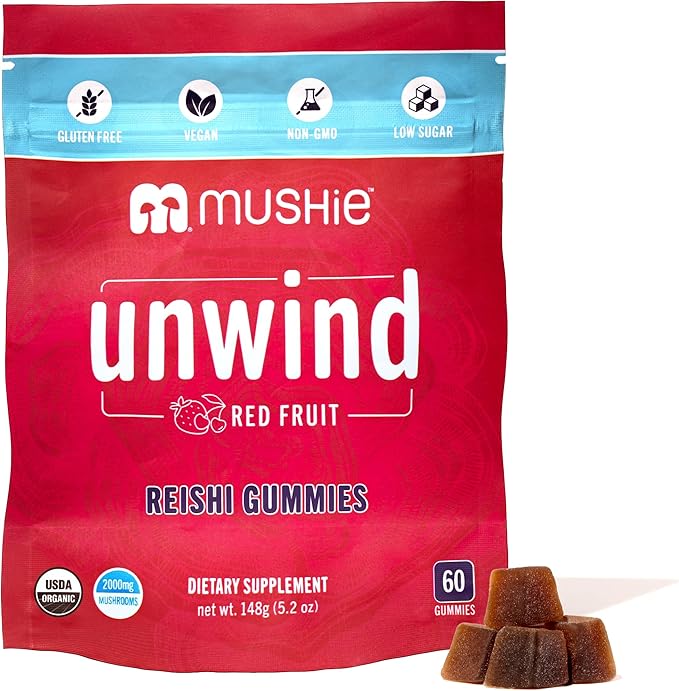 Mushie 100% Organic Reishi Mushroom Gummies - 2000mg Reishi Nootropic for Relaxation, Sleep, Cardiovascular Health & Immune Support with Vitamin D - Vegan, Gluten-Free - 60 Count
