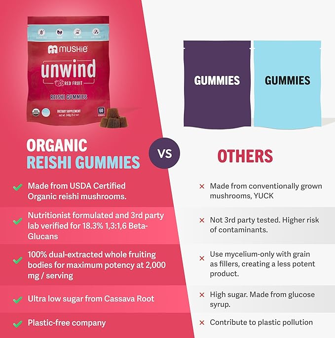 - MINDFUL INGREDIENTS, MAXIMUM IMPACT: Indulge guilt-free with only 1g of sugar per gummy (the lowest on the market) derived mainly from Cassava root. No fillers, just pure, effective mushroom goodness. Third-party lab tested for transparency, potency, and quality assurance.