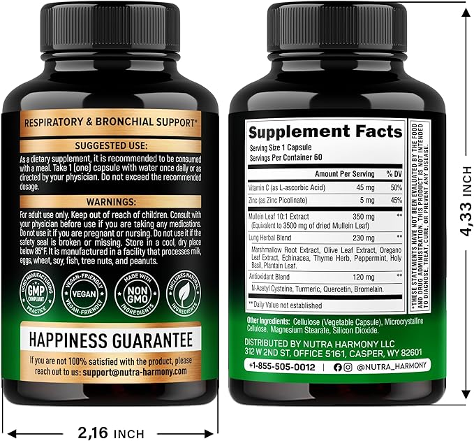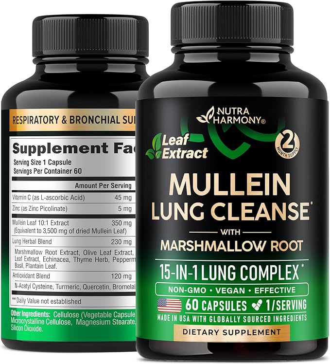 - Trustworthy Service — We are committed to providing exceptional customer service and transparency with NUTRAHARMONY’s carefully selected lung cleanse and detox multicomplex! Highest quality & purity to ensure the best results! With our mullen supplement, you can trust that you're receiving premium-quality mullen leaves capsules backed by scientific research and dedicated customer support!